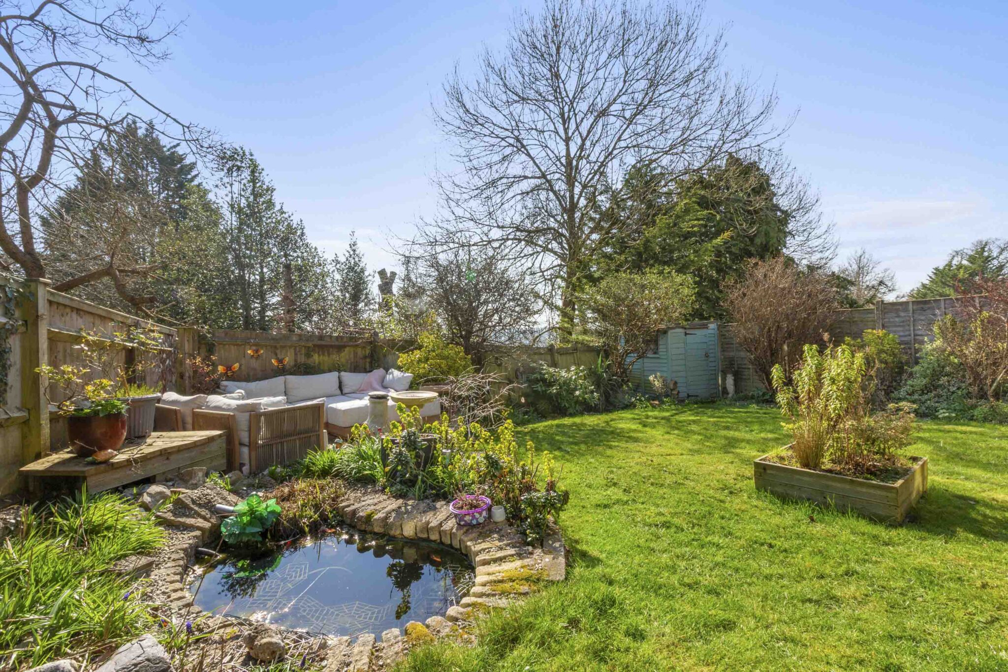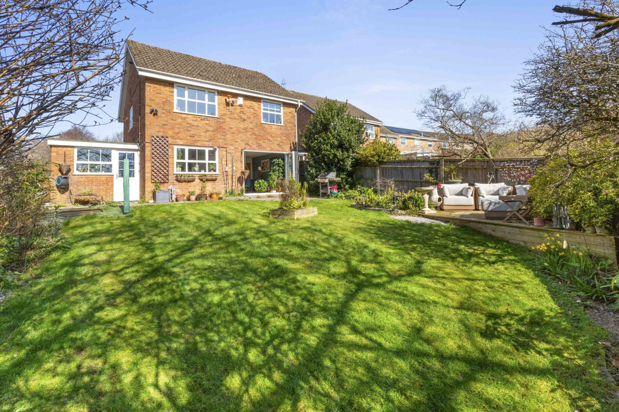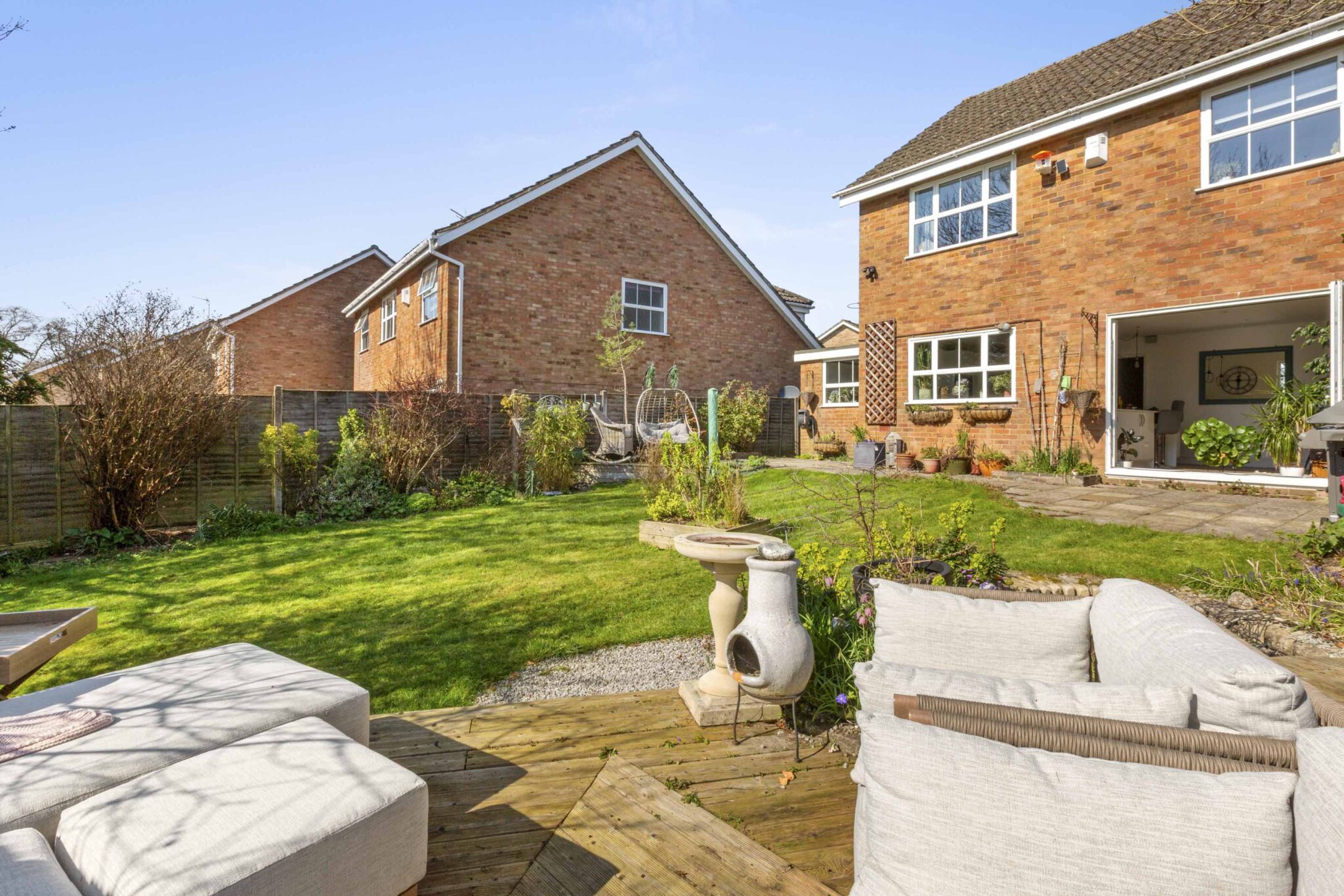 Outside, the property is laid open plan style with a level front garden, a spacious driveway for ample off-road parking, and an attached garage for secure storage. To the rear, the generous garden is maintained with mature trees, shrubs, lawns, and multiple patio and seating areas - perfect for relaxing, hosting gatherings, or allowing children to play in a safe and private environment.