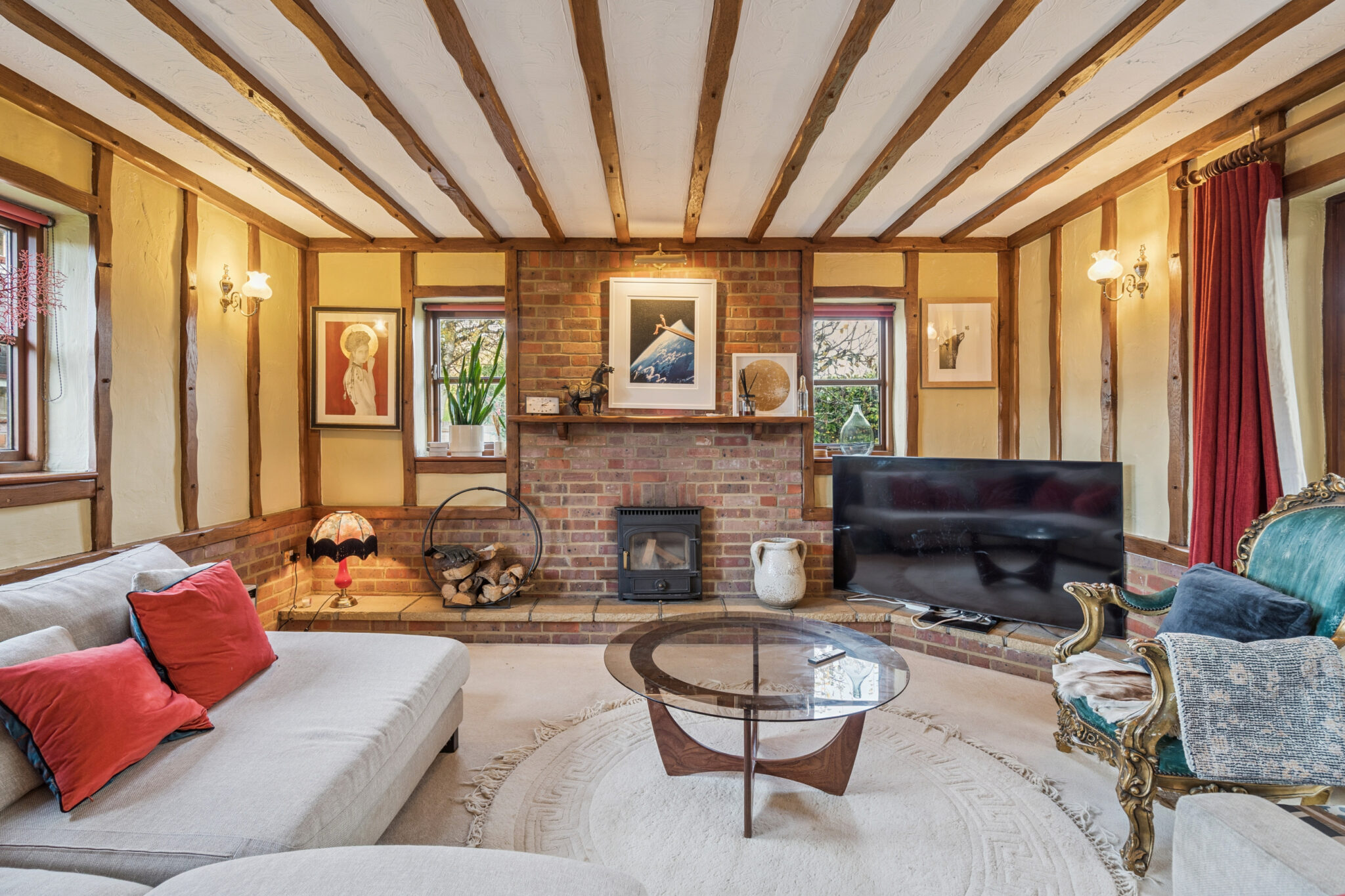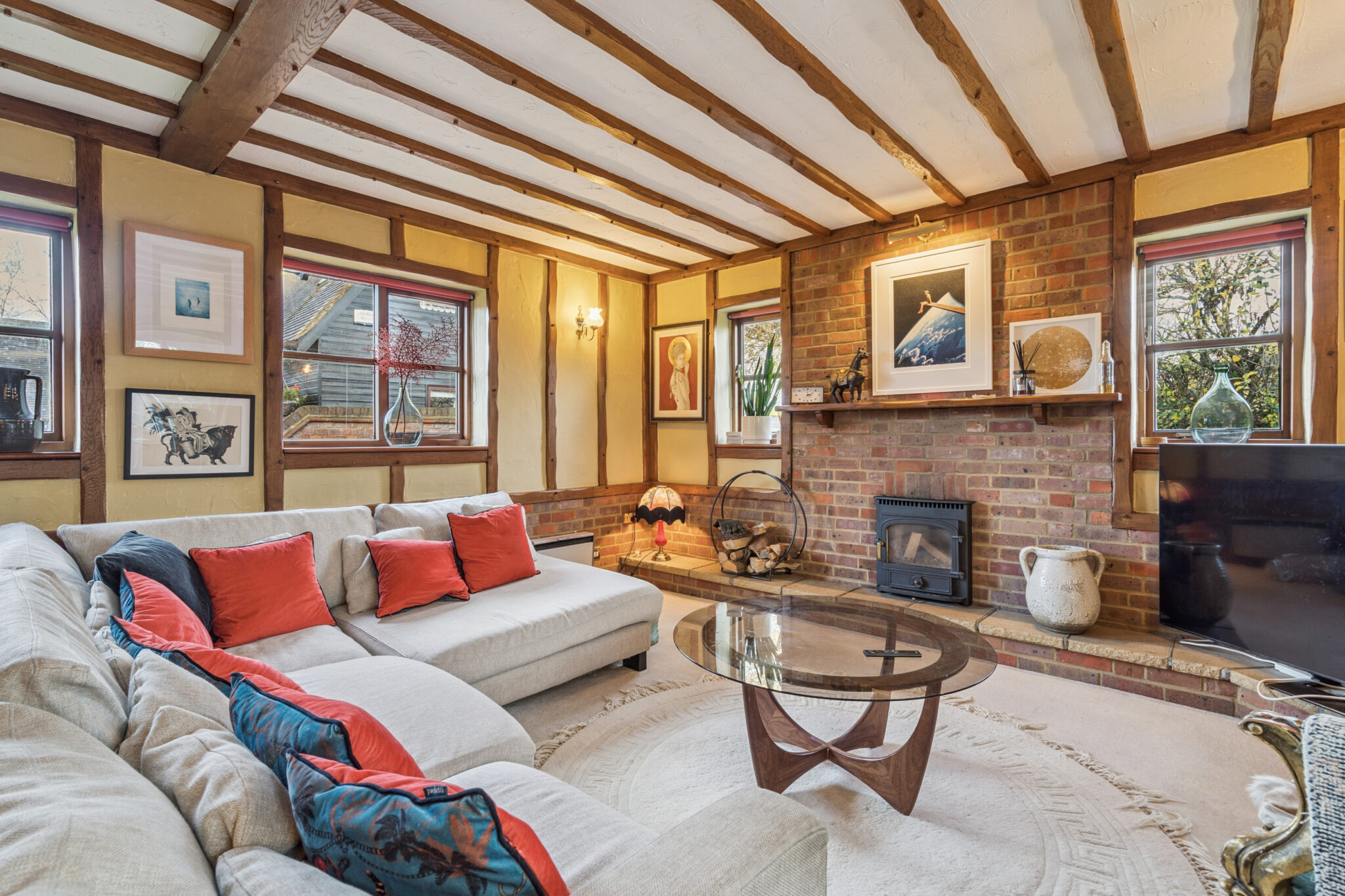 Inside, the inviting sitting room centres around a cosy wood burner, creating a welcoming atmosphere during the cooler months. The generous kitchen and dining area also feature a wood-burning stove—perfect for both family gatherings and culinary pursuits.