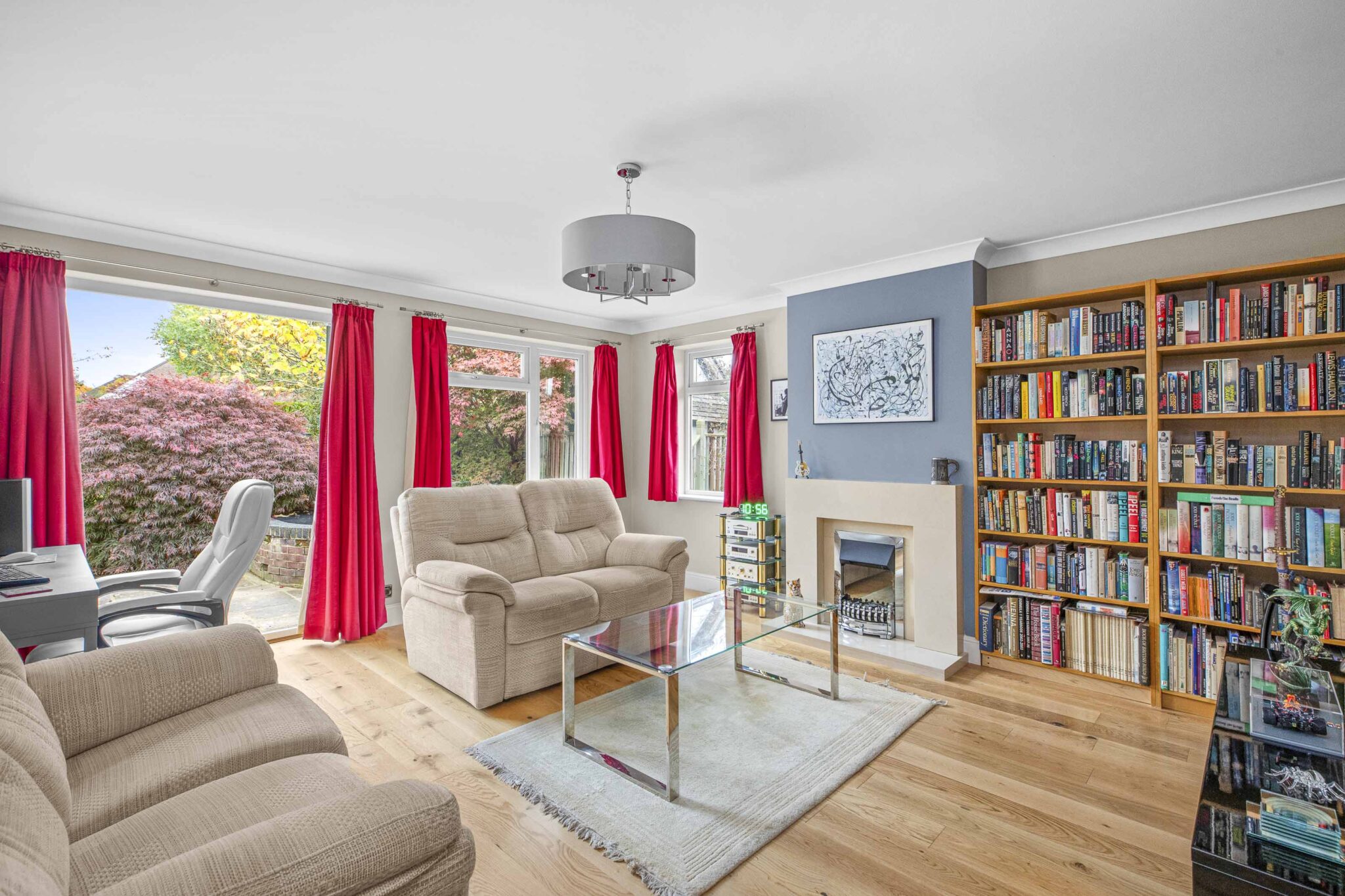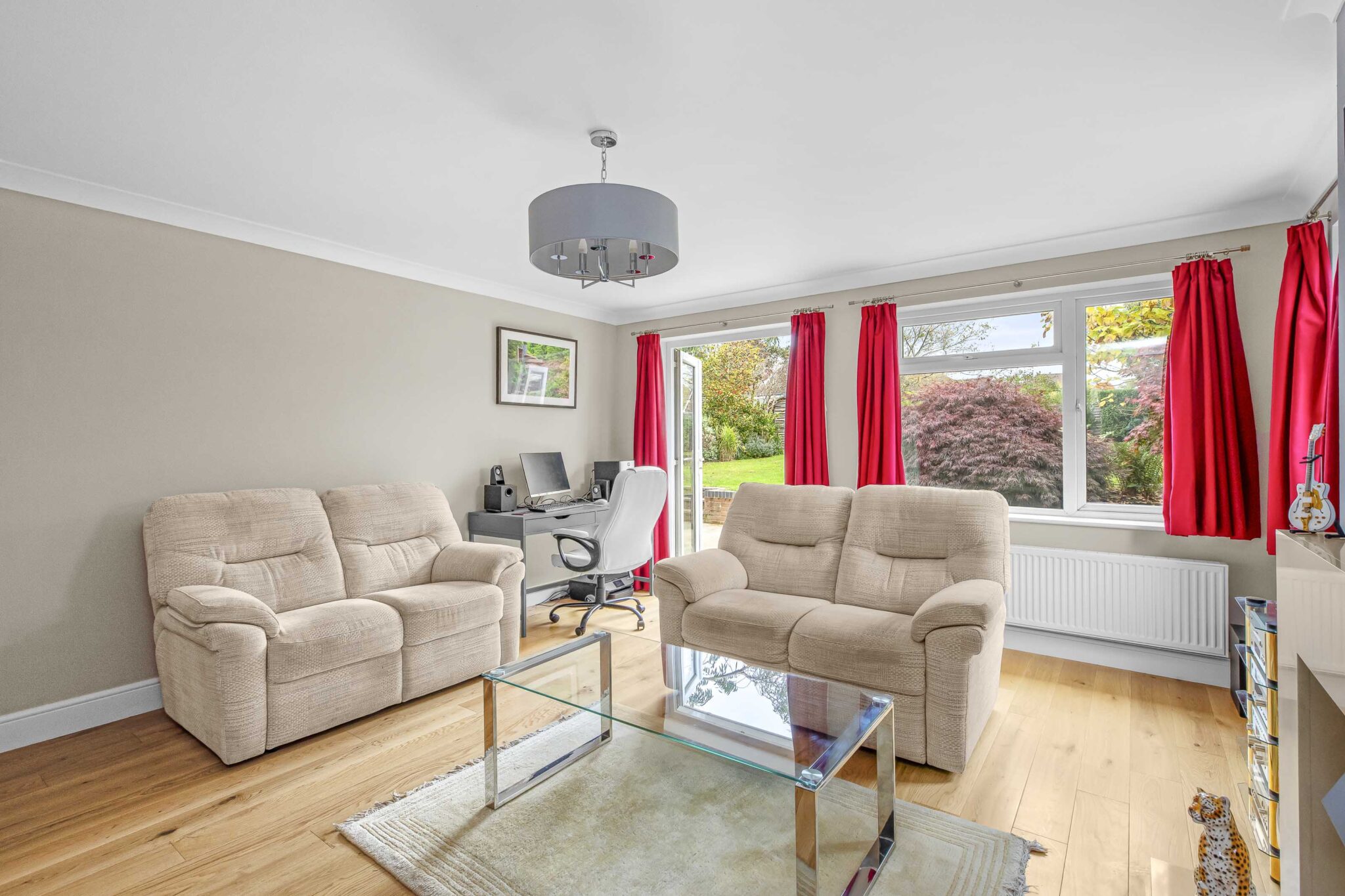 • Light & spacious sitting room with oak flooring, feature fire and patio doors to garden