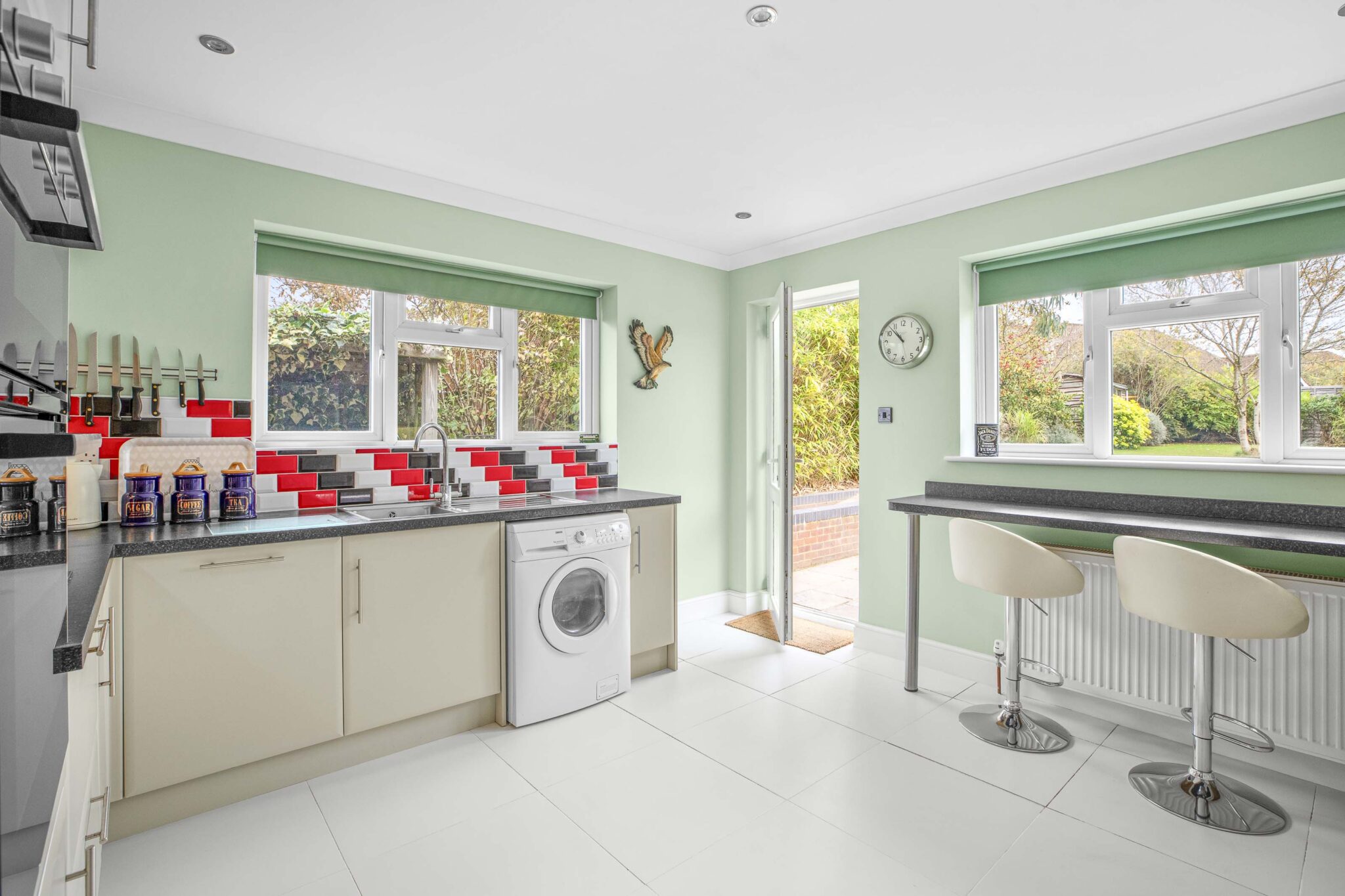 • Refitted kitchen/breakfast room with a range of base and eye level units with some integrated appliances and breakfast bar overlooking garden and door to outside