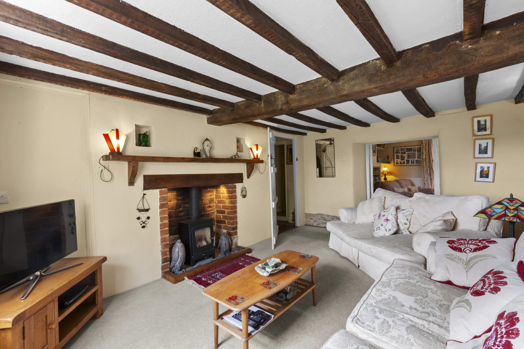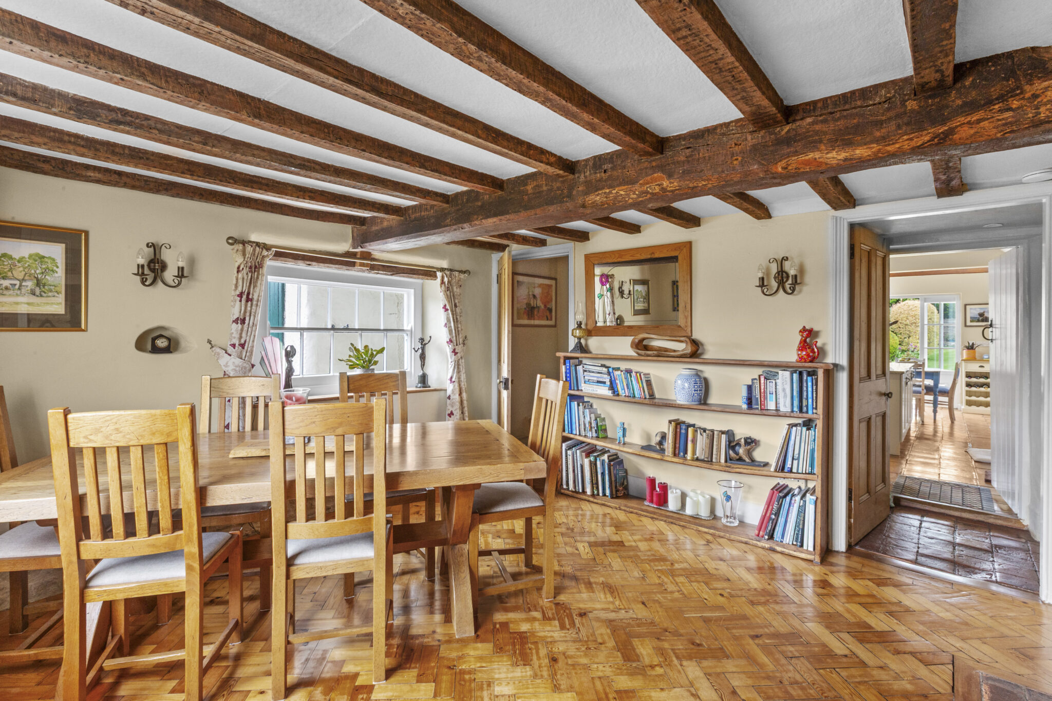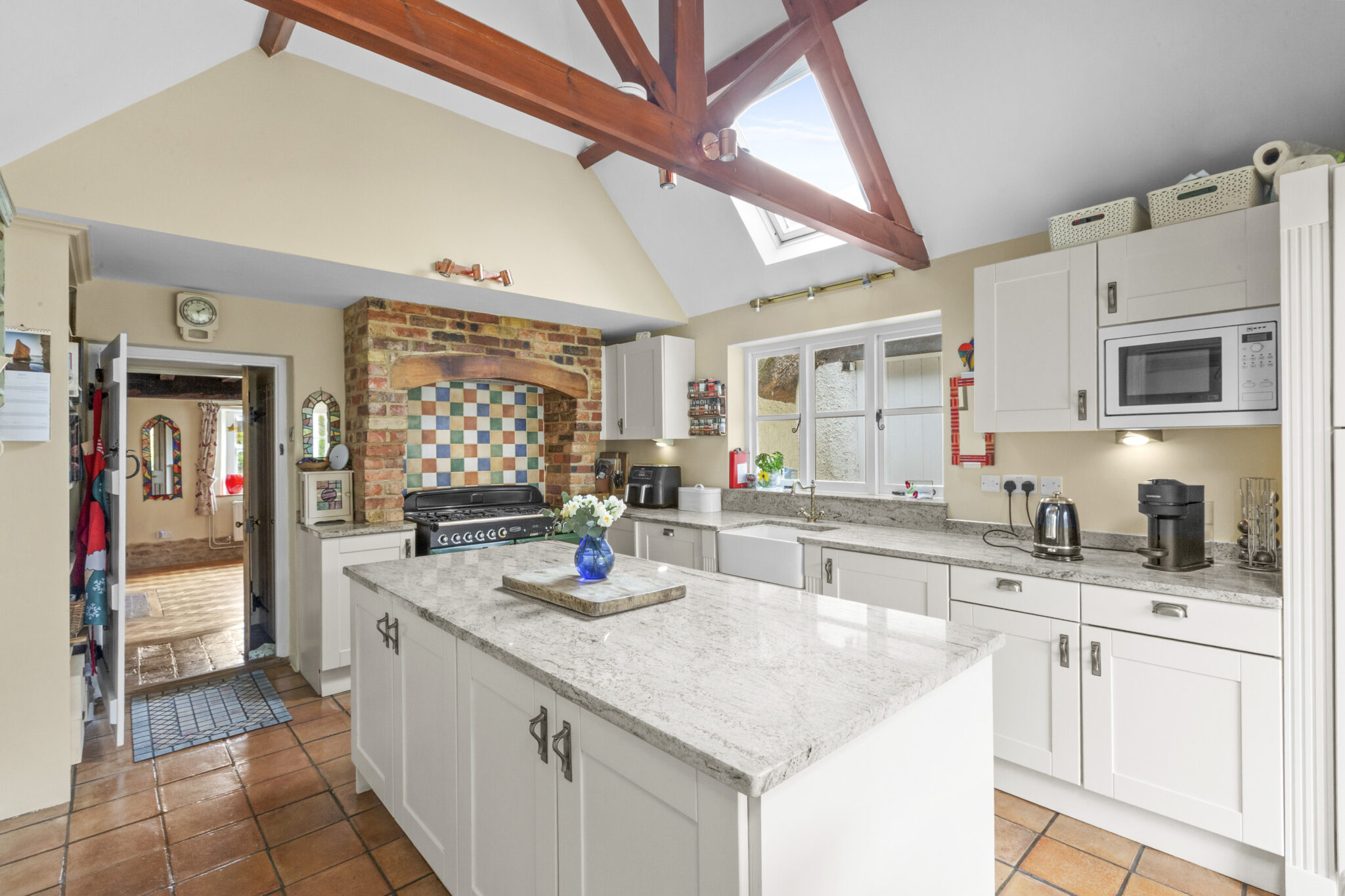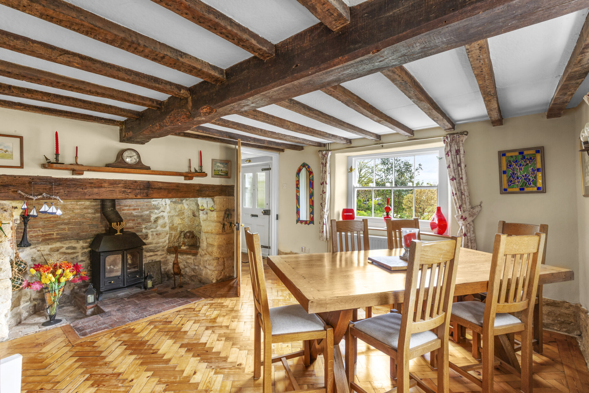 Upstairs, four beautifully presented bedrooms include a refined principal suite with contemporary shower room, complemented by a stylishly updated family bathroom. The home is rich in period detail, with exposed beams, latched doors and exquisite limed plasterwork, all carefully preserved and enhanced.
