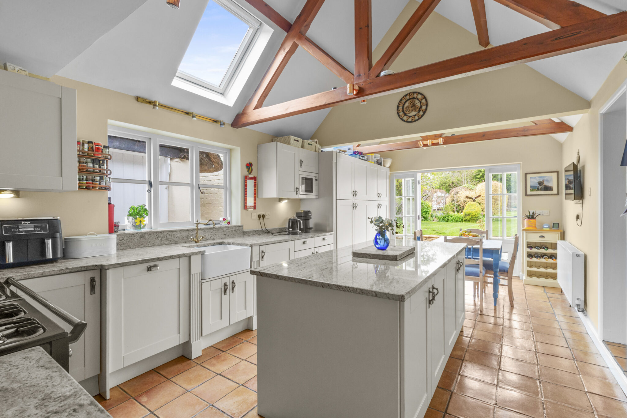 Rich in character yet effortlessly elegant, the interior offers an array of impressive reception spaces, including a welcoming living room with gas stove and a striking dining room centred around a magnificent inglenook fireplace and restored parquet flooring. A generous family room and a light-filled garden room open seamlessly onto the terrace, perfect for modern living and entertaining. At the heart of the home lies a breathtaking vaulted kitchen, thoughtfully reimagined with bespoke Shaker-style cabinetry, a central island, integrated appliances and a separate utility.