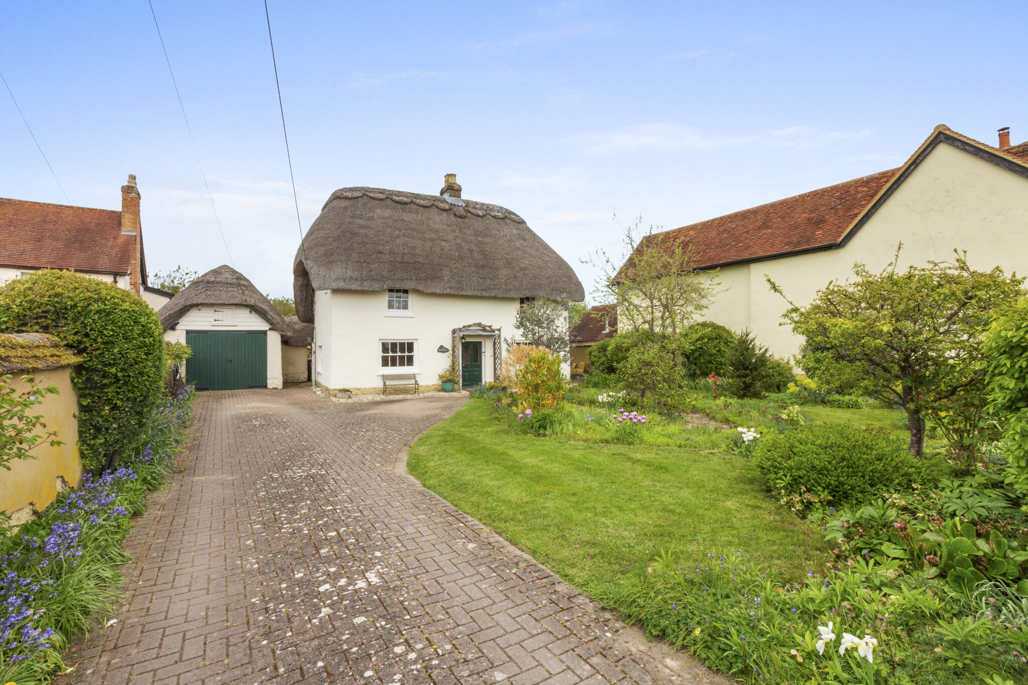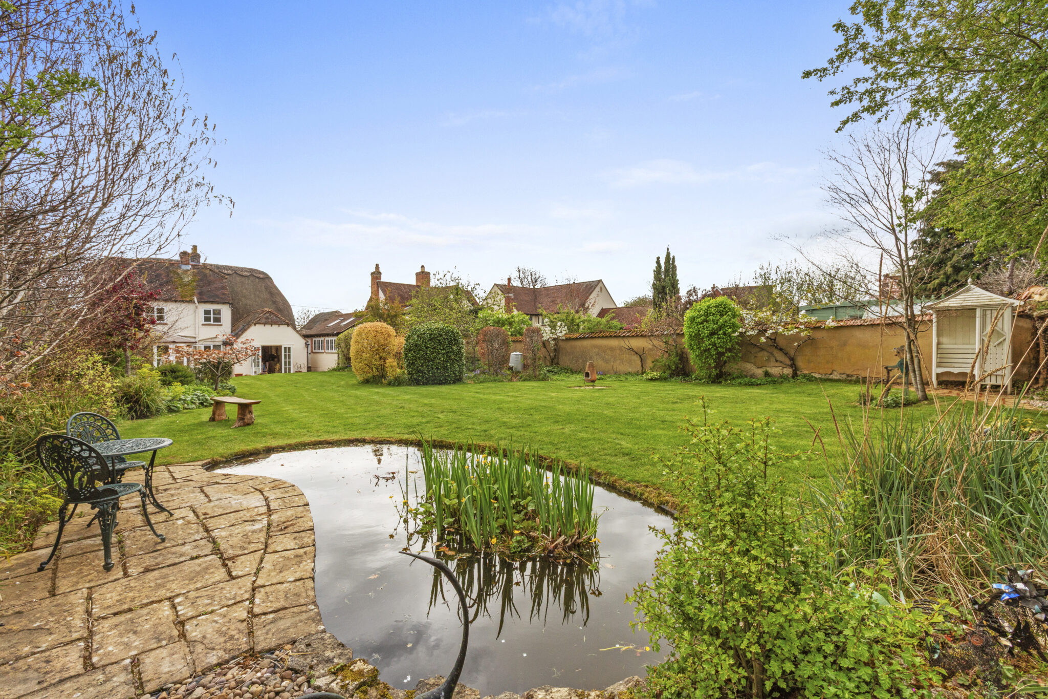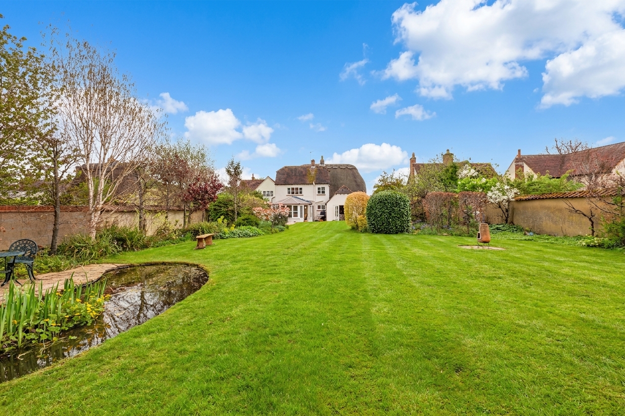 Set behind a private driveway with ample parking and a charming detached thatched garage, the gardens are a standout feature—expansive lawns, a split-level terrace, vibrant herbaceous borders and an ornamental pond create a picturesque setting. A detached studio adds further versatility, completing this outstanding village home.