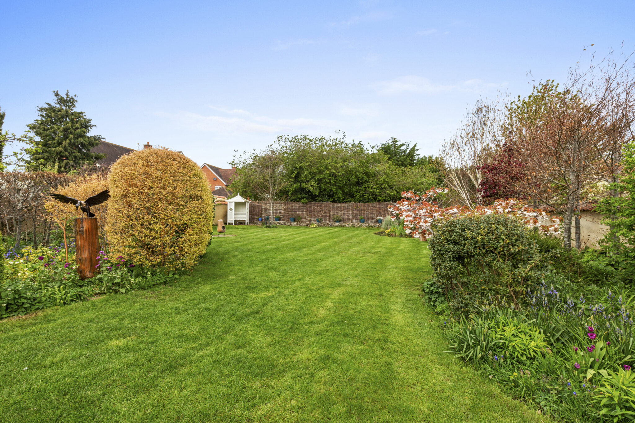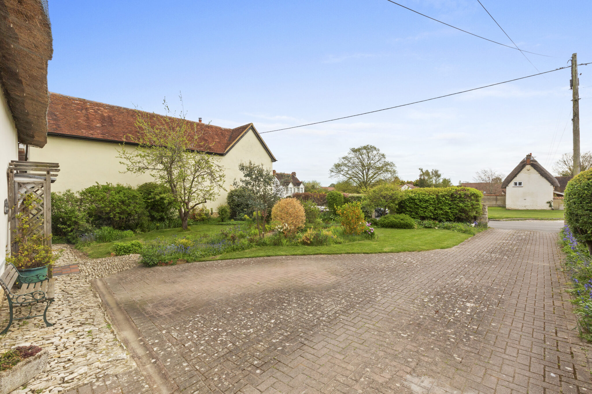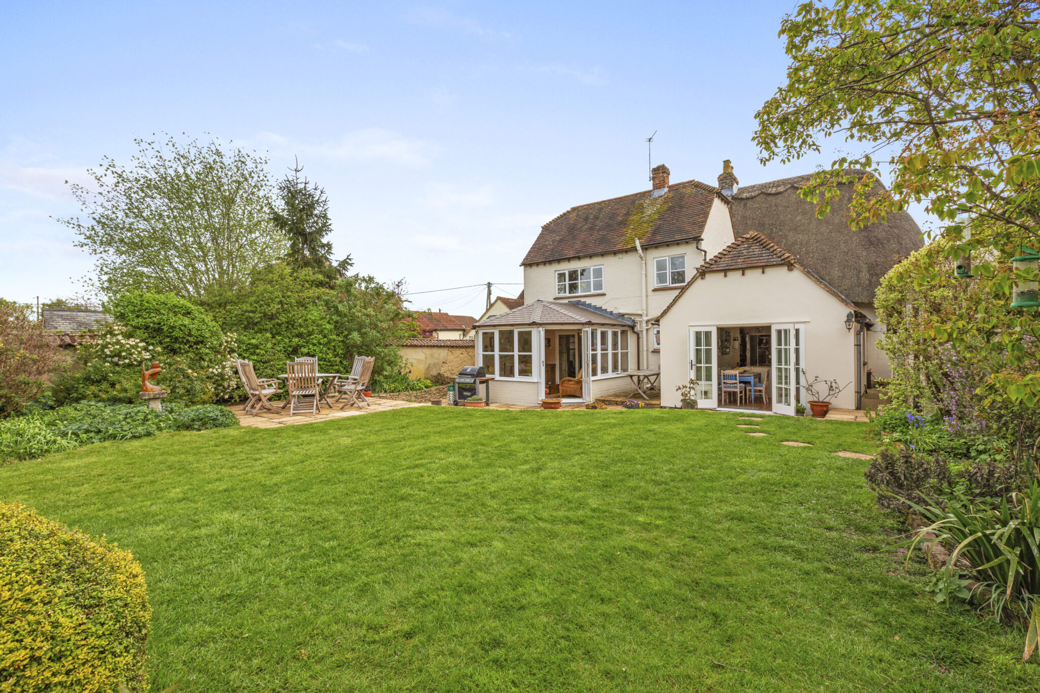 Set behind a private driveway with ample parking and a charming detached thatched garage, the gardens are a standout feature—expansive lawns, a split-level terrace, vibrant herbaceous borders and an ornamental pond create a picturesque setting. A detached studio adds further versatility, completing this outstanding village home.