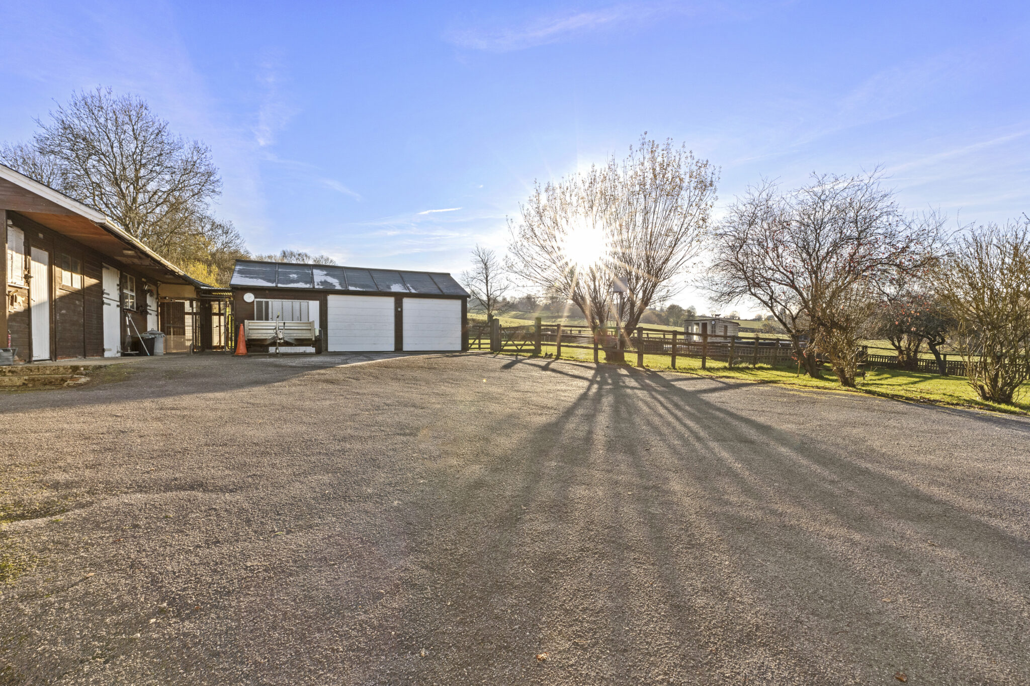 Through the entrance gate is a large tarmac driveway and parking area, with an adjacent stable block incorporating tack room and stores, workshop and a double garage.