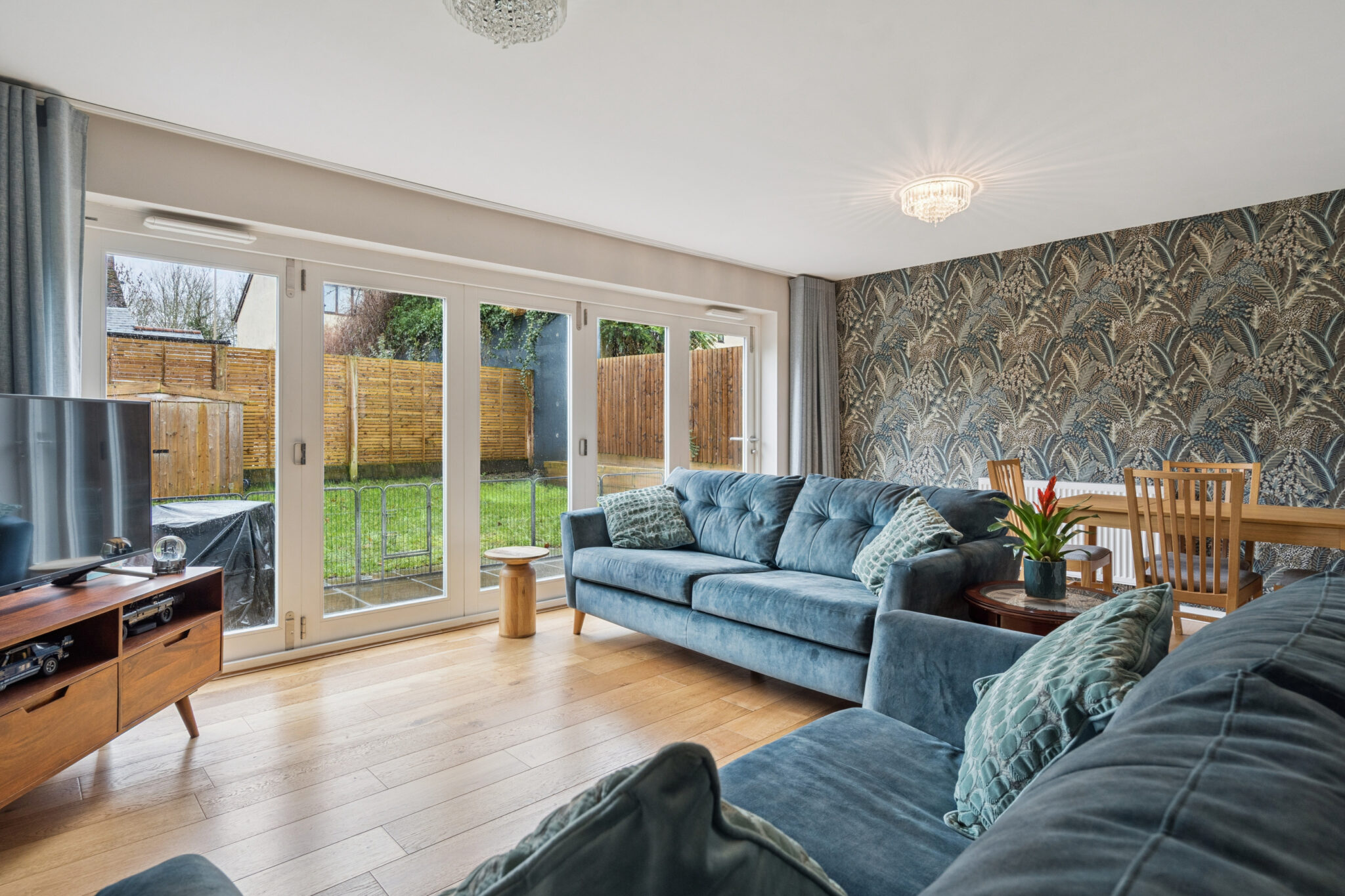 The ground floor offers a clean, open-plan layout, enhanced by the southerly aspect which allows natural light to pour in through the impressive bi-folding doors opening onto the garden. This creates a warm and welcoming atmosphere, ideal for socialising and entertaining. The entrance hall flows seamlessly into the contemporary kitchen, which is both stylish and highly practical, featuring integrated appliances and generous worktop space. The kitchen opens into the living and dining area, forming a fantastic overall space with sleek bi-folding doors spanning the rear of the property. A downstairs cloakroom and a useful, large storage cupboard are also located off the hallway.