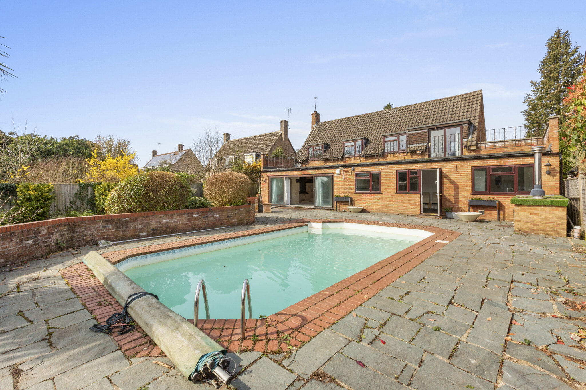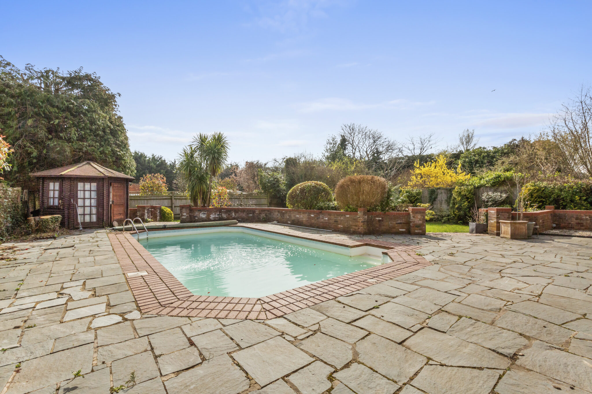 Outside, the good sized garden is mainly laid to lawn with pretty borders, and the swimming pool comes into its own in the warmer months.