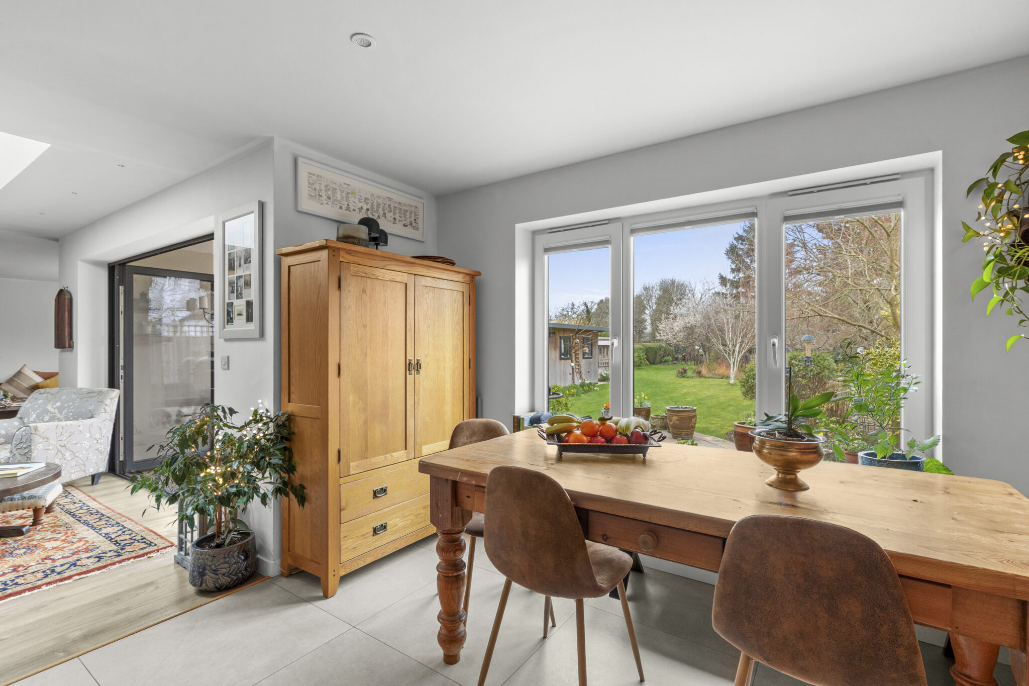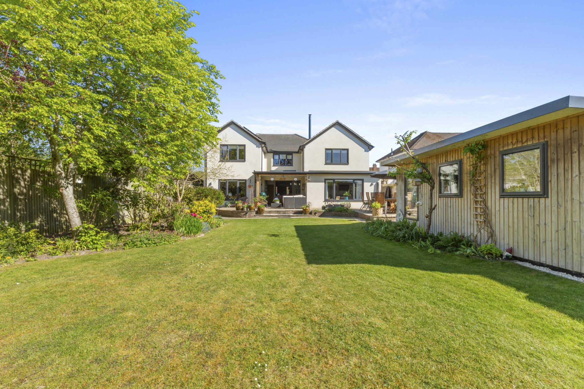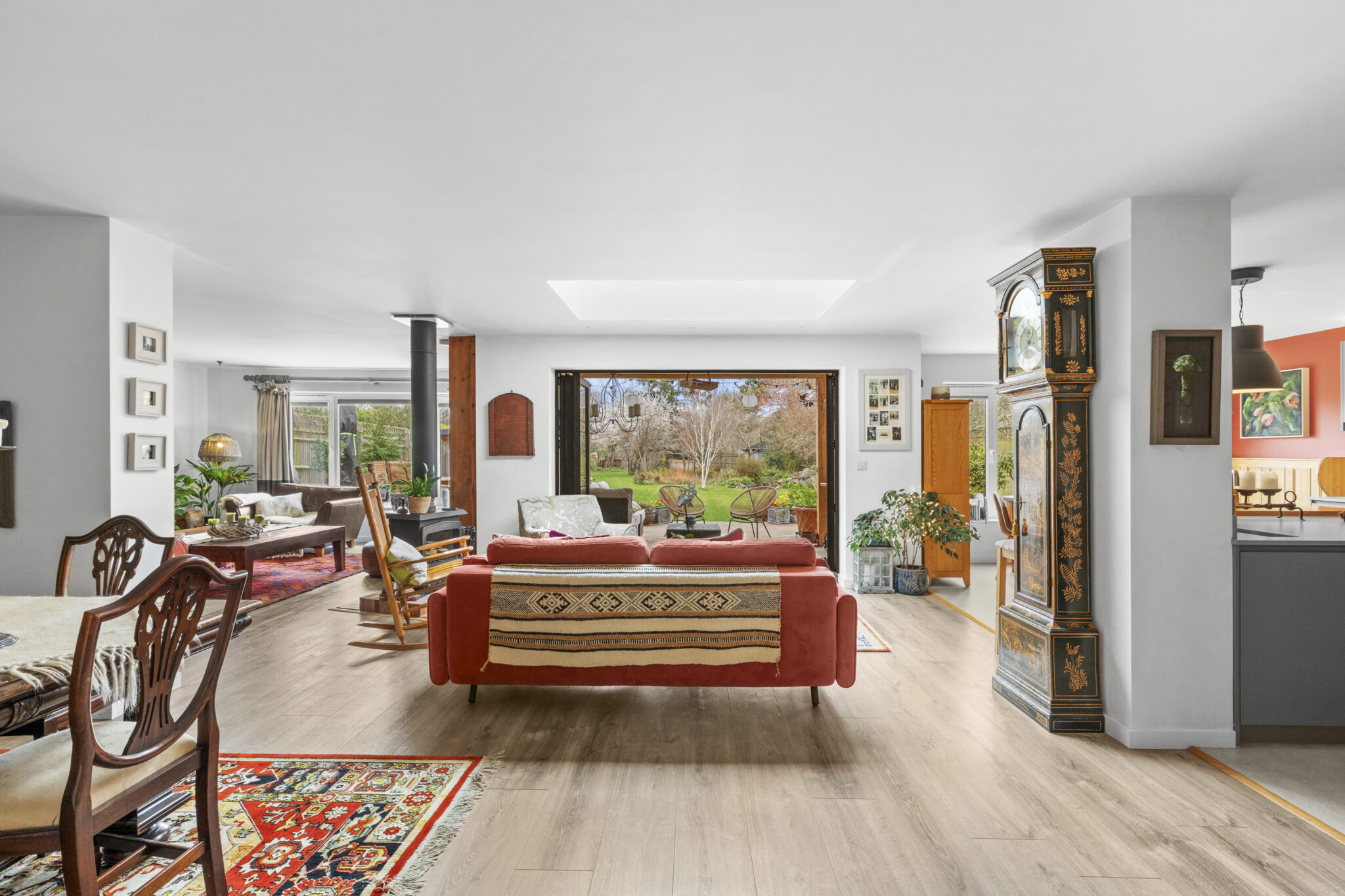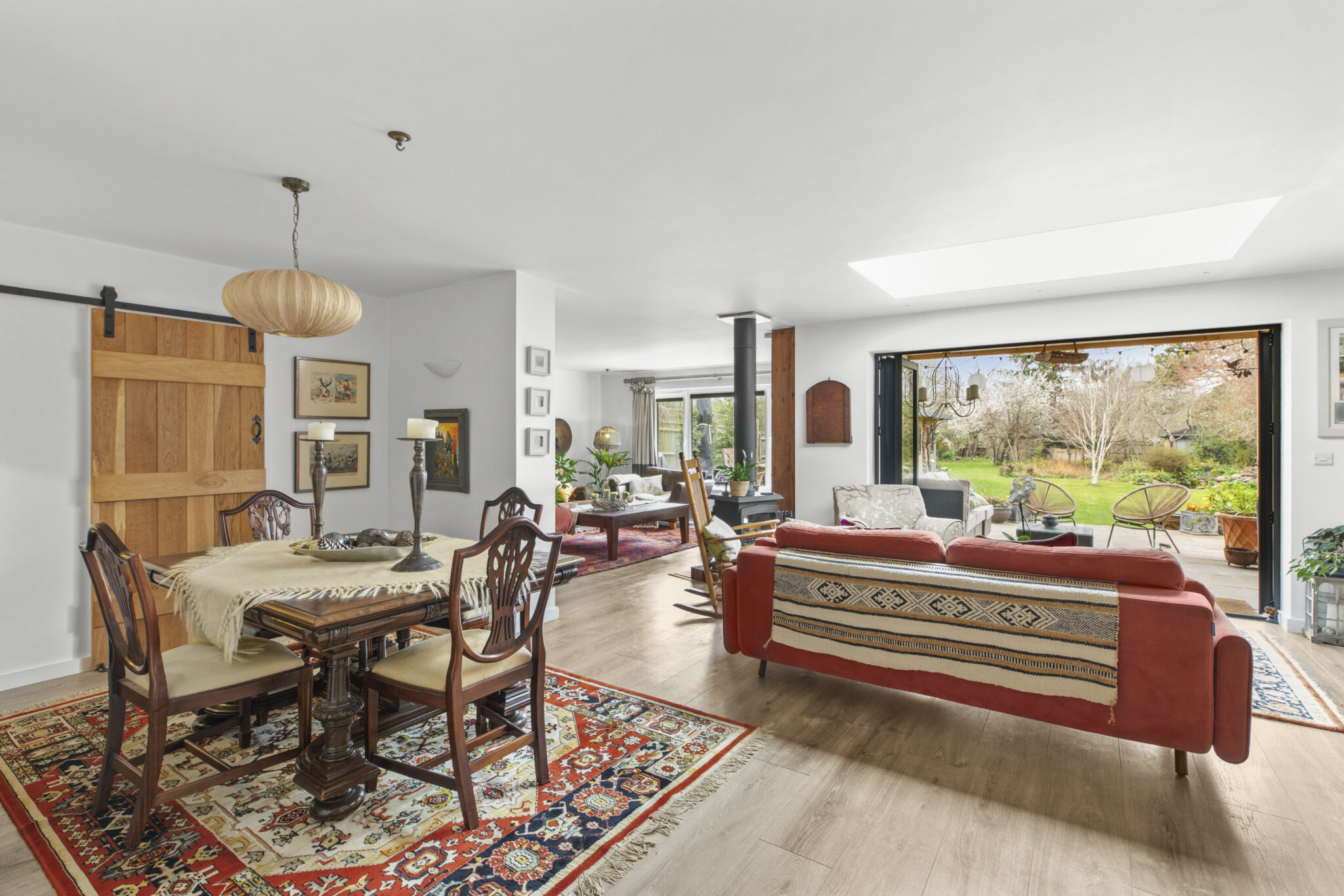 The front door opens into a wide reception hall with an immediate vista through the house to the beautiful rear garden. From the hall there is the staircase to the first floor, along with a study and a bedroom (currently used as a gym), complemented by an adjoining shower room. At the heart of the home lies an impressive open plan living space, perfect for everyday living and entertaining. The beautifully fitted and fully equipped kitchen/breakfast room flows seamlessly into the dining and sitting areas, with a striking centrally positioned double sided wood-burning stove forming a natural focal point between the spaces and creating a warm and inviting atmosphere. Bi-fold doors open onto the patio, framing the view and providing a seamless connection to the garden beyond. Completing the ground floor is a practical utility room which leads through to the garage/store. Upstairs, there is a lovely large open landing space with excellent storage. The main bedroom suite features a vaulted bedroom section, adjoining dressing room and beautifully appointed shower room. Bedroom two has an ensuite shower room and the remaining two bedrooms are served by a quality four-piece family bathroom.