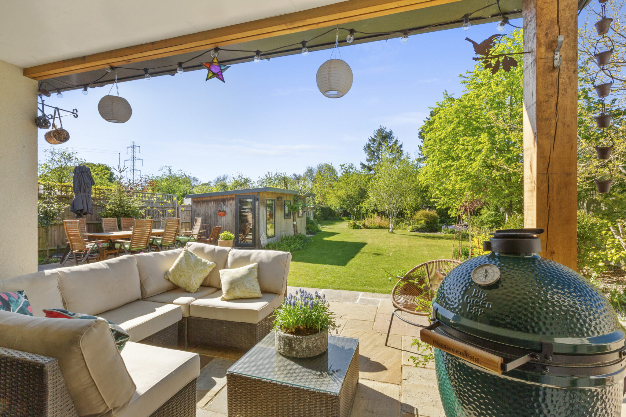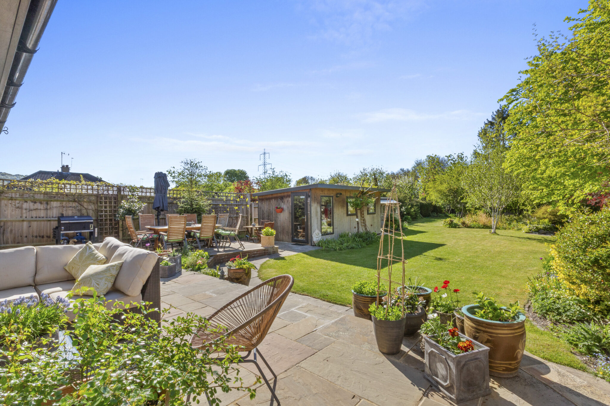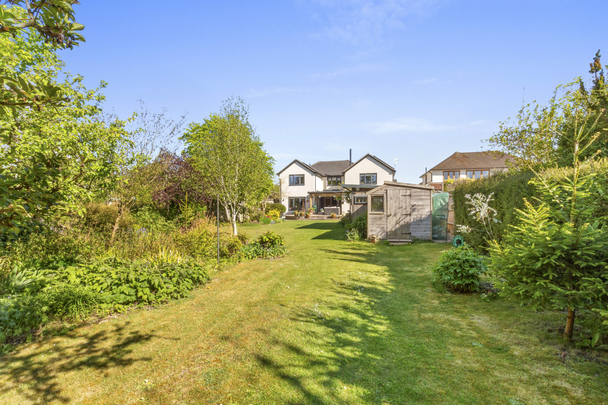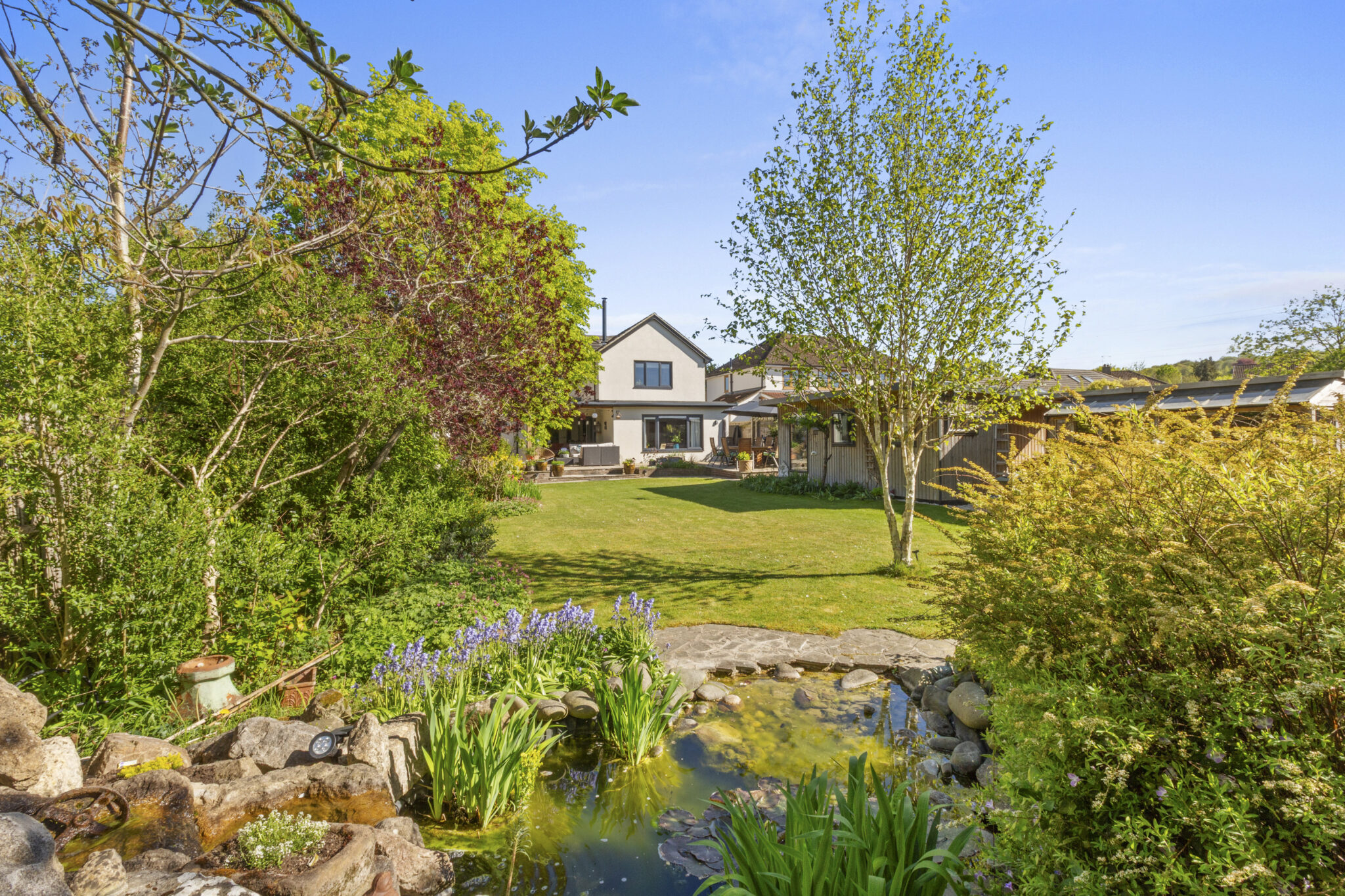 The mature rear garden is a particular highlight and enjoys a sunny south westerly aspect. A raised terrace spans the rear of the house incorporating a recessed loggia, creating a superb space for outdoor dining and entertaining. The wide expanse of lawn stretches away with well stocked beds and borders. A garden pond with rockery and waterfall attracts a variety of wildlife. There is a modern garden room, currently used as a studio/workshop but equally suited as an excellent home office. Towards the foot of the plot lies a more wild garden section along with a garden store.