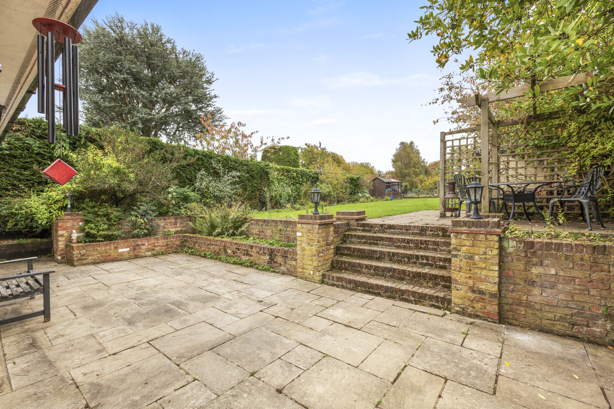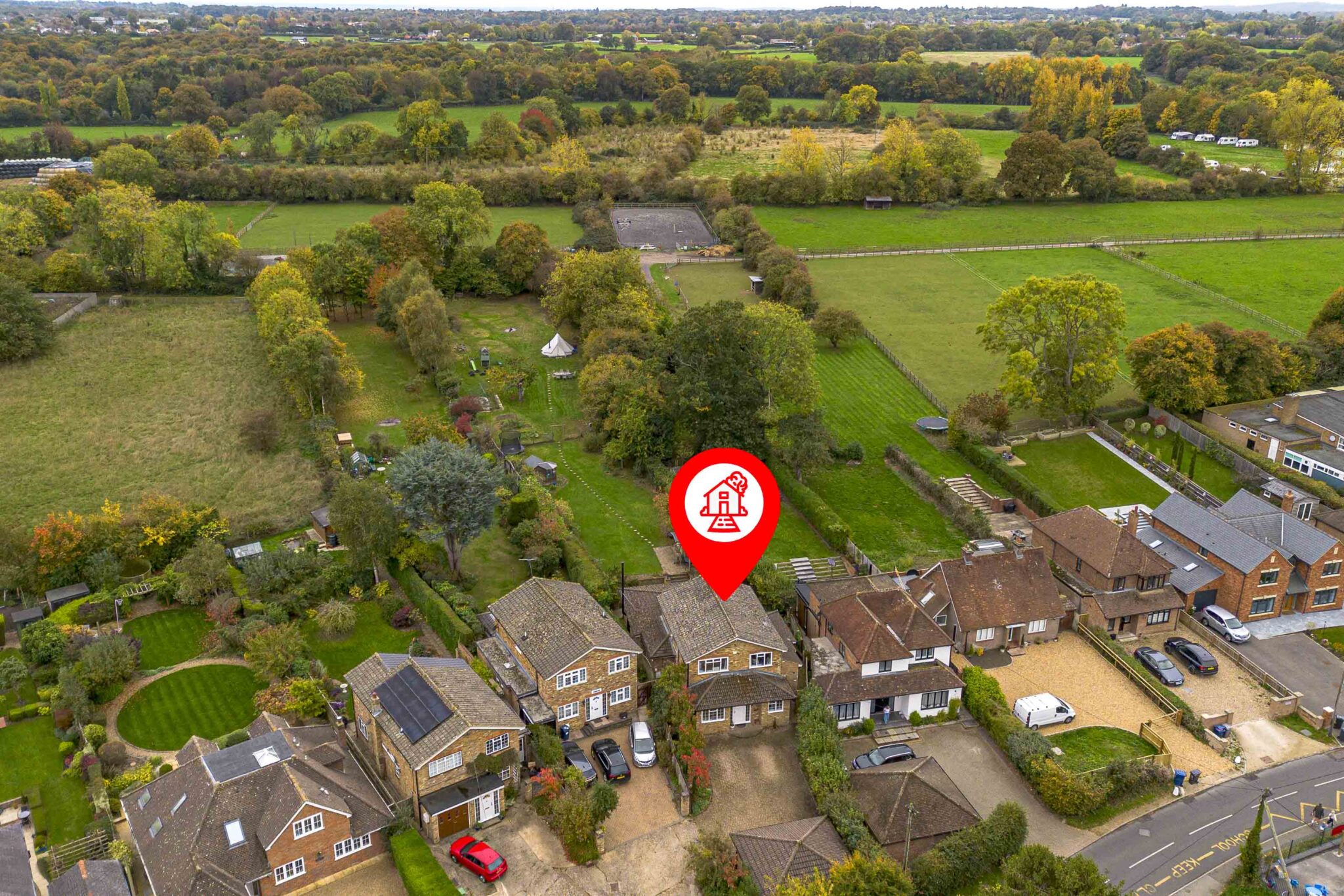 The rear garden is southerly facing and mostly laid to lawn, with a paved patio and pergola providing space to relax and entertain. Beyond the garden lies one of the standout features of the property; a private paddock with mature trees, open views, and a smaller timber barn for storage. With its own gated access from Watchet Lane, the paddock offers exceptional flexibility for recreation, animals, or simply space to enjoy the outdoors. To the front, a sweeping driveway provides parking for several vehicles and leads to a detached double garage. An electric vehicle charging point is also installed. The location offers easy access to highly regarded schools, open countryside, and fast rail connections into London.