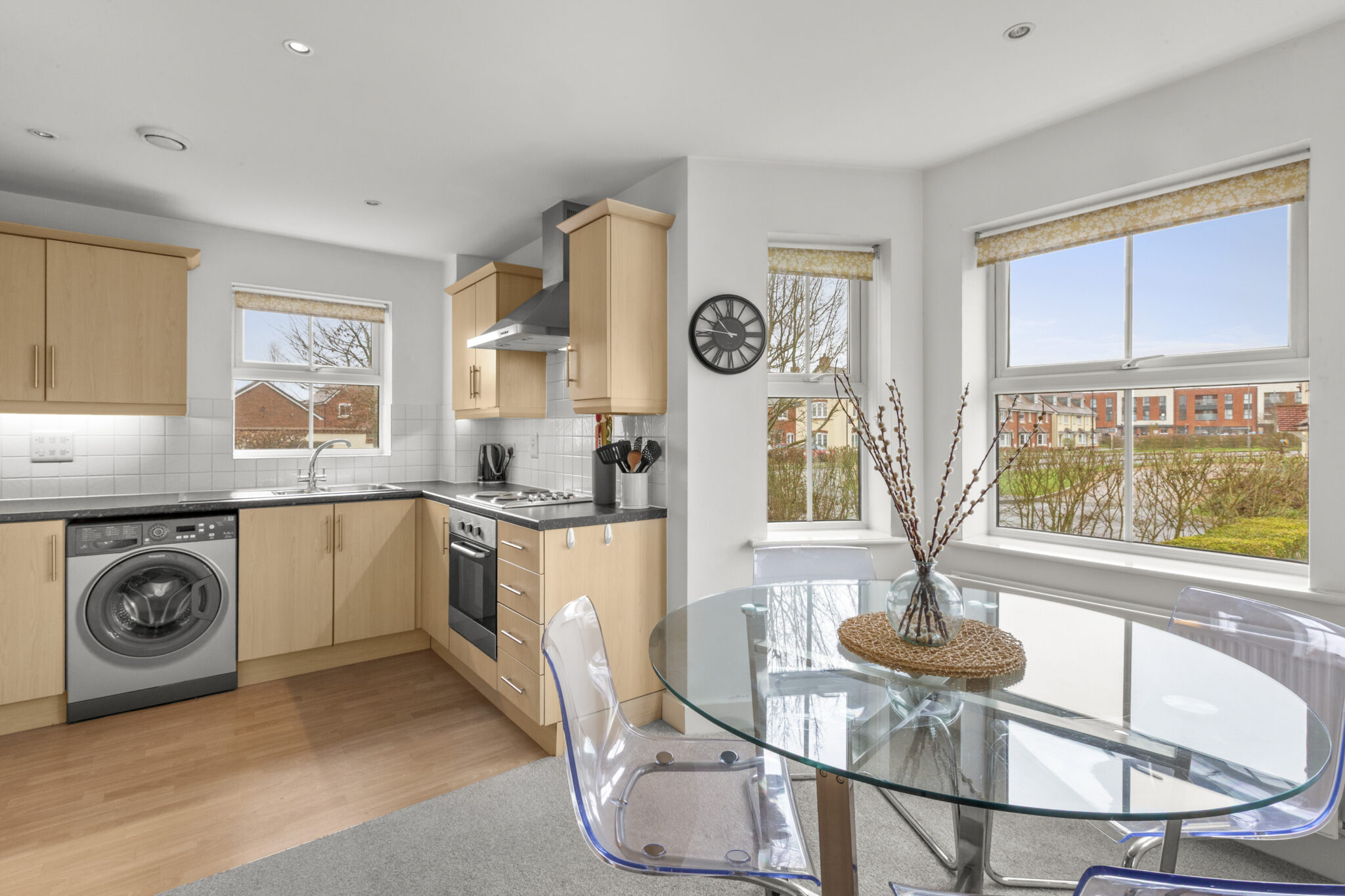 At the centre of the home is a stylish, well-equipped kitchen and dining area. A charming bay window allows natural daylight to pour in, creating a bright and welcoming space perfect for everything from relaxed breakfasts to entertaining friends in the evening.