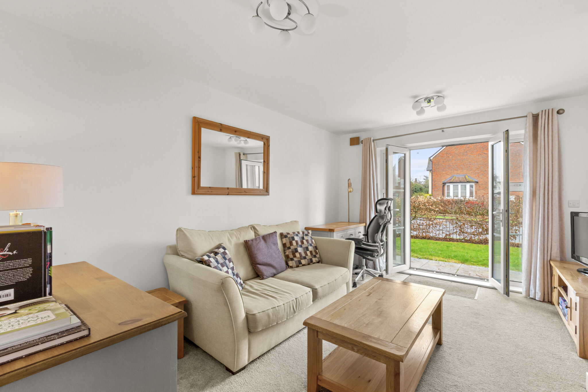The inviting sitting room features double doors opening onto a private terrace — an ideal spot for morning coffee or unwinding with a good book. A spacious, well-appointed bathroom combines practicality with contemporary style, while thoughtful finishes throughout make the property truly move-in ready.