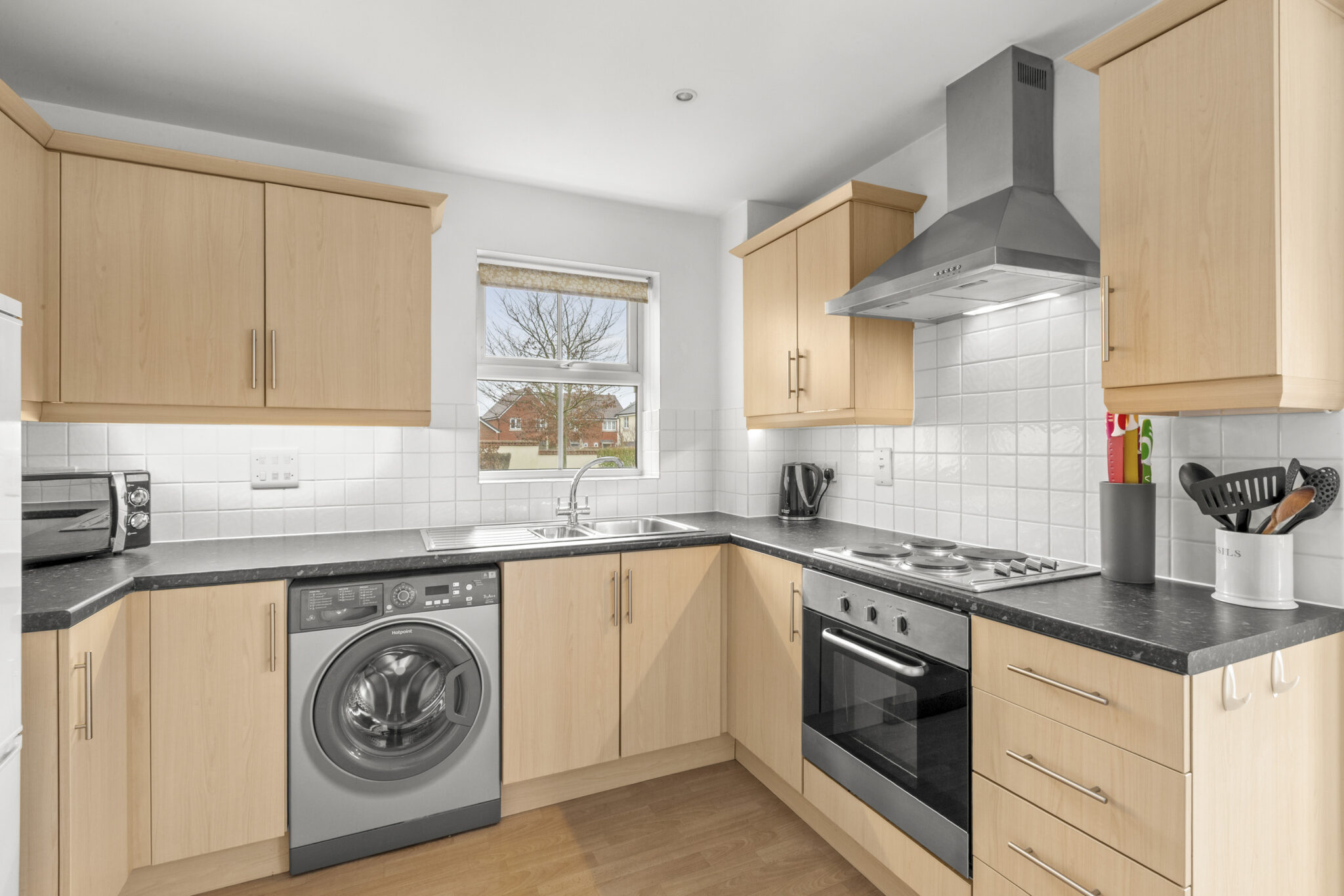 At the centre of the home is a stylish, well-equipped kitchen and dining area. A charming bay window allows natural daylight to pour in, creating a bright and welcoming space perfect for everything from relaxed breakfasts to entertaining friends in the evening.