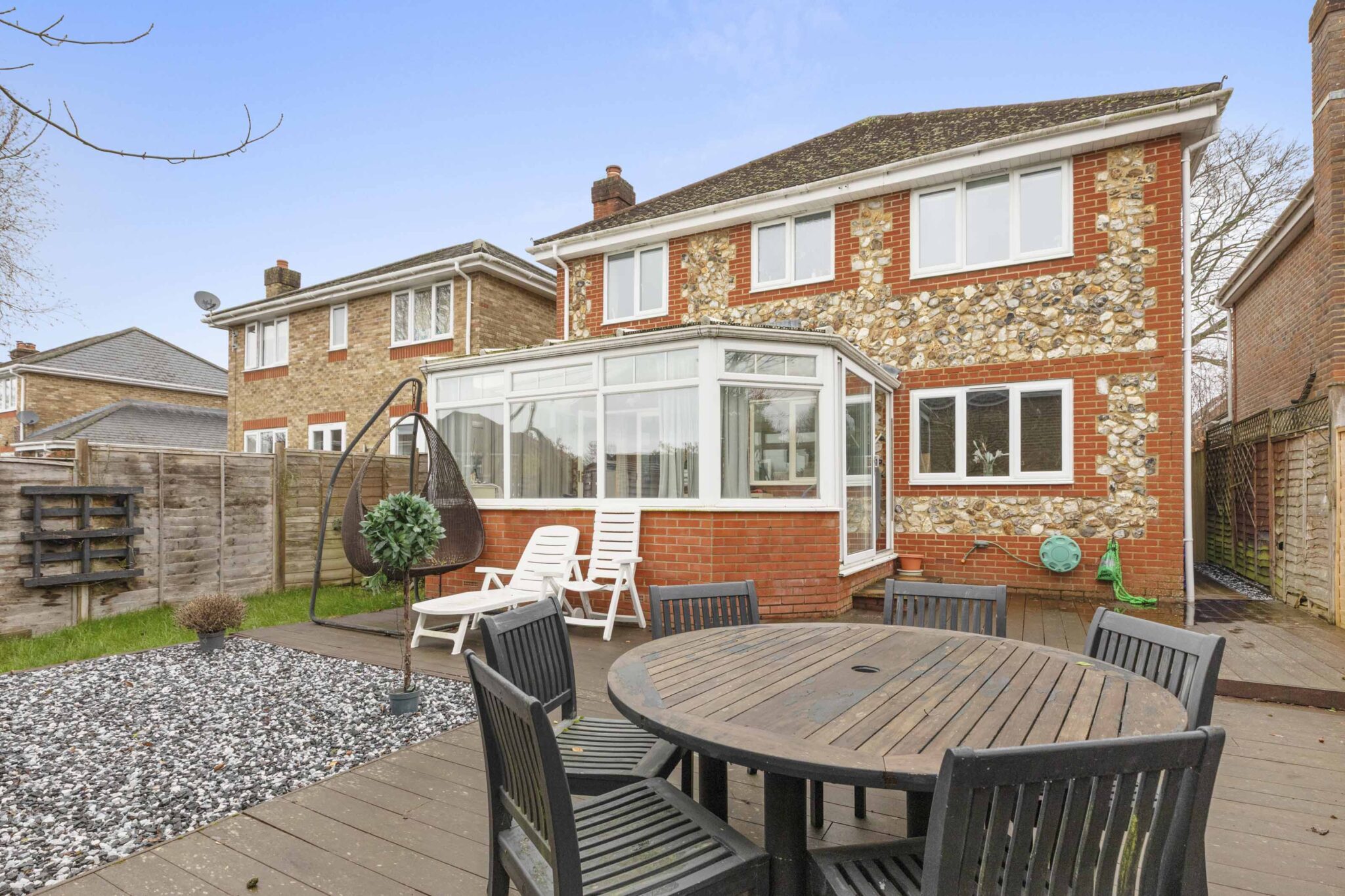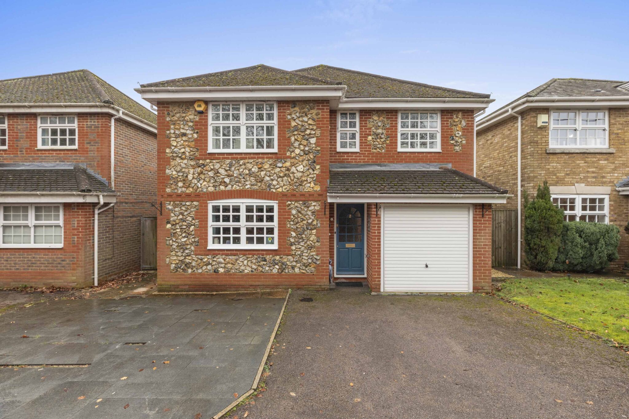 A modern detached home with attractive brick and flint elevations, driveway parking, and a landscaped south-westerly rear garden.